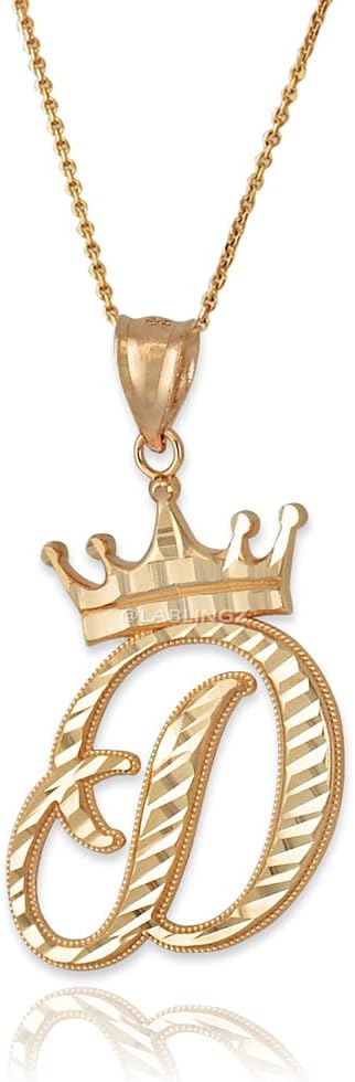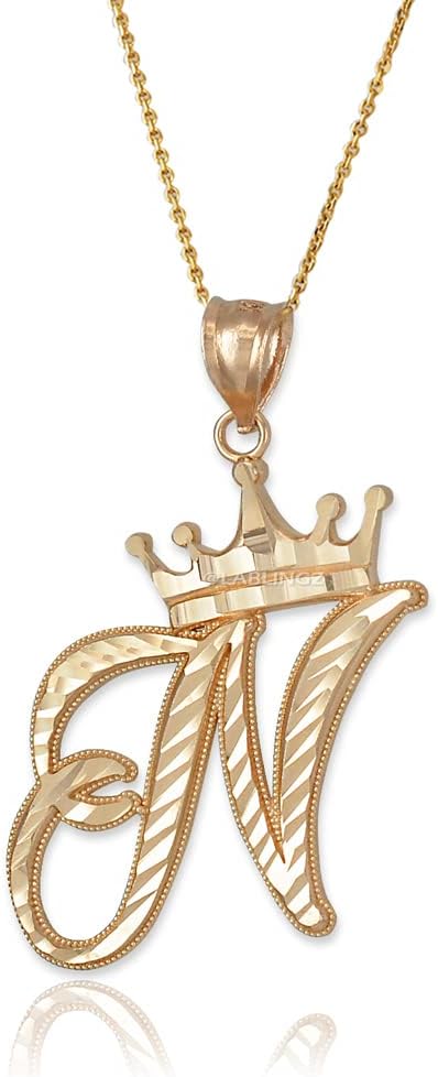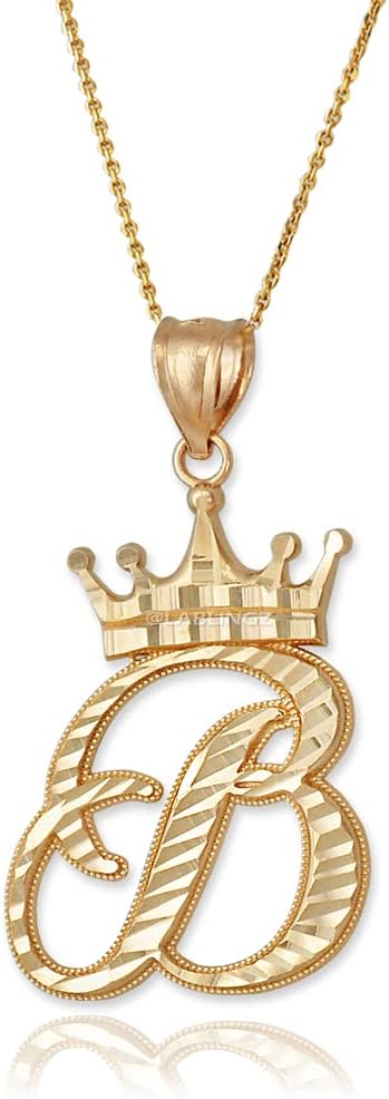 Make a statement with this 10K Yellow Gold Cursive Crown Letter Initial Pendant Necklace. Each pendant is crafted with care and made from high-quality 10K Yellow Gold, featuring a unique cursive font and a delicate crown design. Choose the initial of your first name, last name, or a loved one for a personal touch. Comes with an adjustable chain, making it the perfect gift for yourself or someone special. Shop now at LA Bingz. Letter: A Metal: Yellow Gold Purity stamp: 10K. Average Pendant weight: ≈2.4 g. (varies for each letter). Pendant height (w/ bail): 1.5" (37.5 mm). Average Pendant width: 0.8" (12 mm) (varies for each letter). Available in 16", 18", 20", 22" chain length. Chain type: 0.7 mm Rolo. Chain weight: ≈1 g. Bail opening: 3 mm. Finish: Diamond-cut polish.