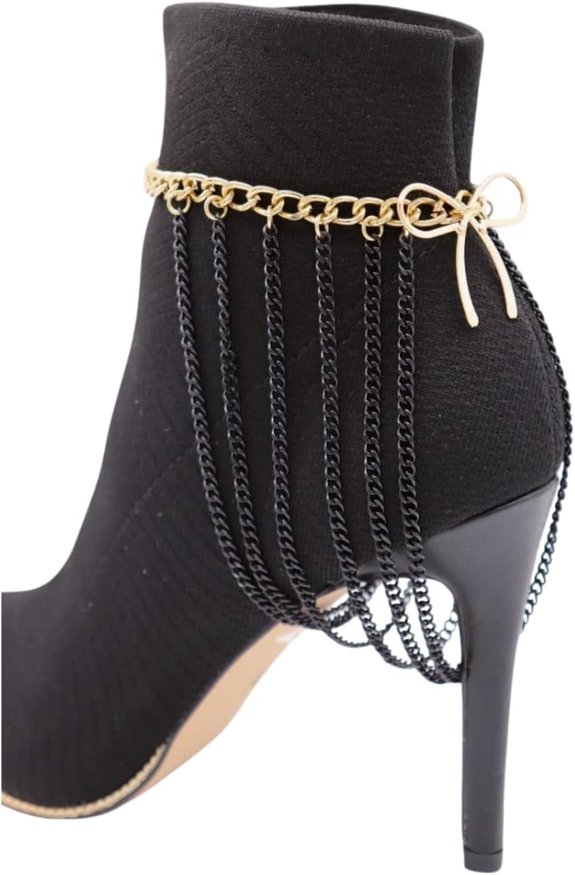 BC198 Bring the drama to your boots—without changing your whole outfit. BC198 is a black-and-gold boot chain bracelet set with a sleek gold top chain and cascading black strands that create a bold fringe effect. The bow detail adds a feminine twist that still feels modern and edgy. Designed to move when you walk, dance, or pose, this piece instantly upgrades boots for rodeo nights, Nashville looks, festivals, and going-out outfits. Adjustable length helps you get the right drape for comfort and durability. Sold as a pair so both boots look perfectly styled.